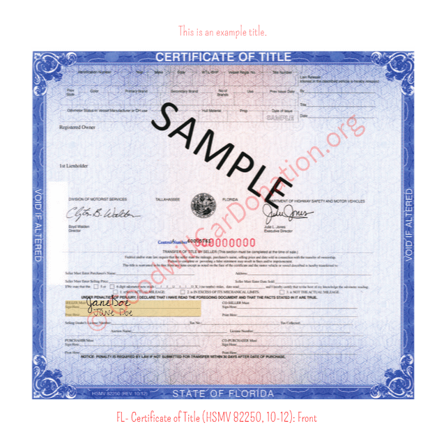 To help with your donation, we have showcased the various Florida vehicle titles below as well as annotated on each title where to print and sign your name. To enlarge an image, simply click on the image. Questions? Give one of our friendly Title Clerks a call at (866) 233-8586.