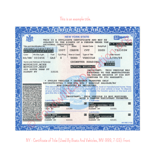 Contact the New York Department of Motor Vehicles: – Title Division: 1-518-486-4714